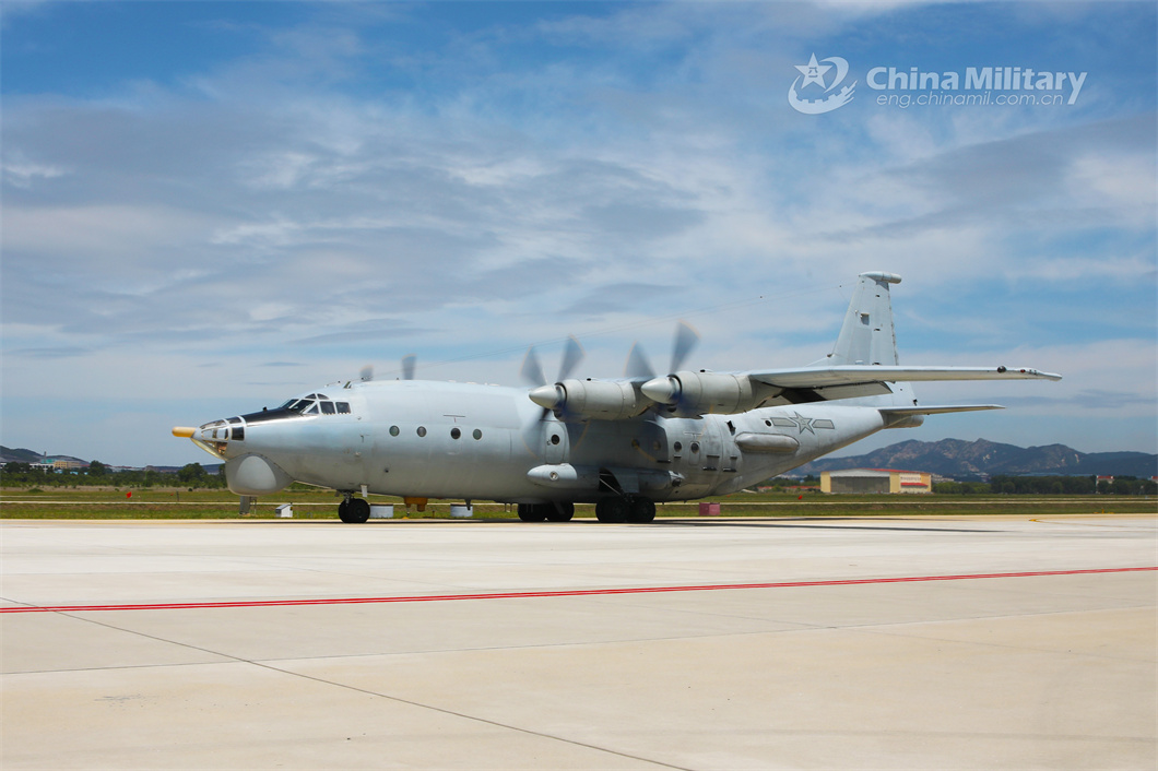 A reconnaissance aircraft attached to a PLA naval aviation regiment taxis on the runway during a round-the-clock flight training exercise. (eng.chinamil.com.cn/Photo by Xing Yun)