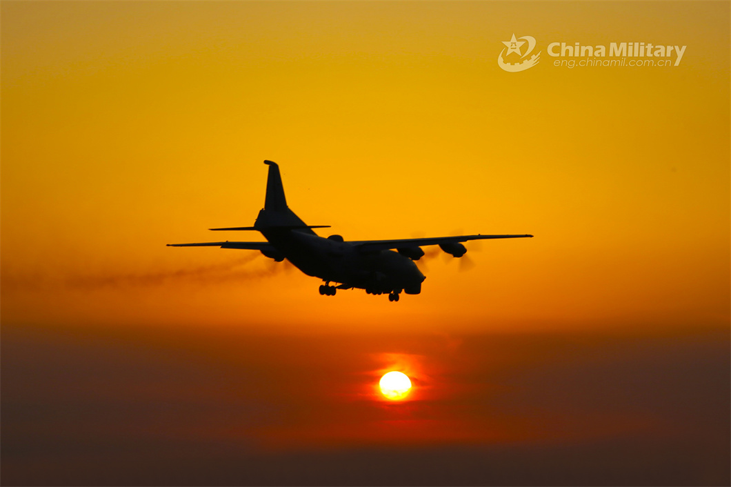 A reconnaissance aircraft attached to a PLA naval aviation regiment flies past the setting sun during a round-the-clock flight training exercise. (eng.chinamil.com.cn/Photo by Li Yang)