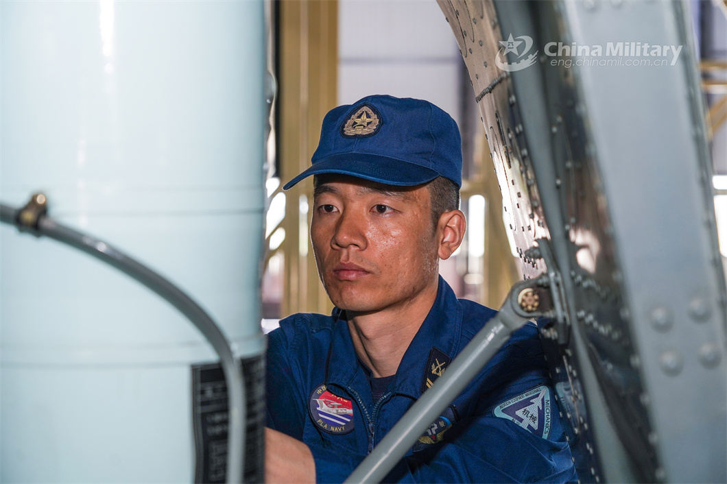 A ground crew member assigned to a PLA naval aviation regiment conducts pre-flight inspection prior to a round-the-clock flight training exercise. (eng.chinamil.com.cn/Photo by Yang Jian)