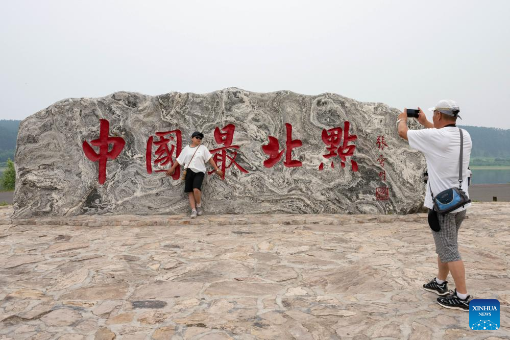 Tourists visit Beijicun, or "North Pole Village," in Mohe, northeast China's Heilongjiang Province, July 1, 2024. Lots of visitors travel to Mohe, China's northernmost city, in summer to enjoy some leisure time. In recent years, Mohe, focusing on its unique location, continues to improve its infrastructure and develop tourism products to attract more tourists in all seasons. (Xinhua/Xie Jianfei)