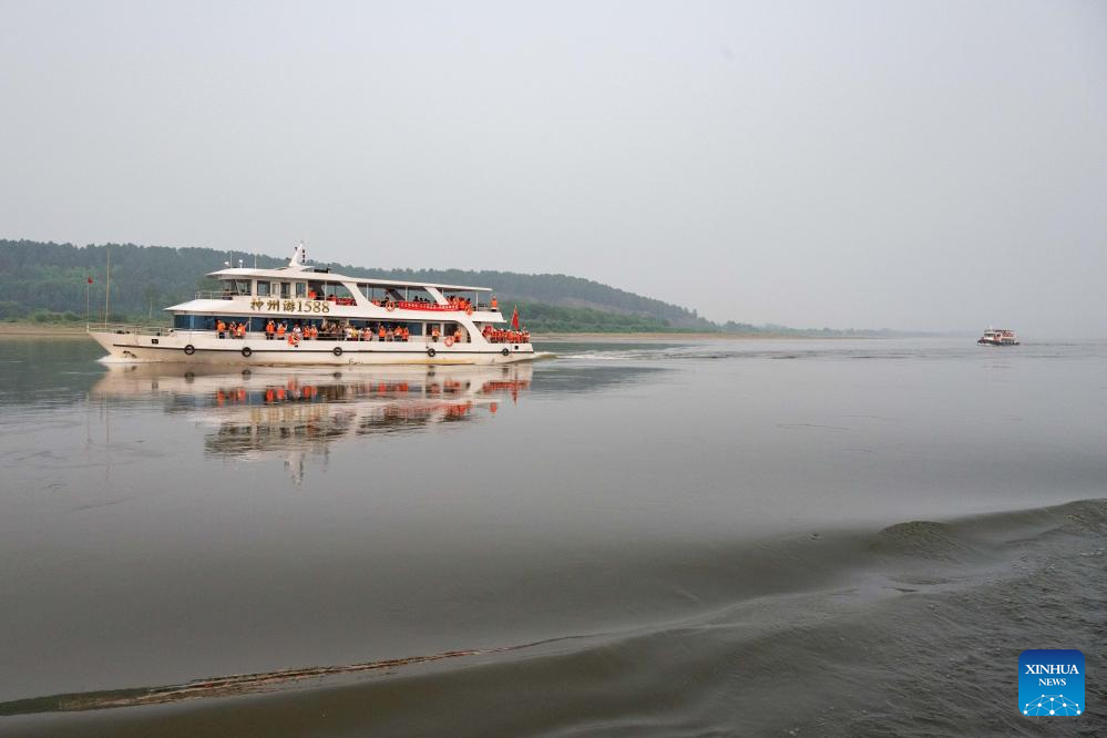Tourists pose for a photo on a sightseeing boat on the Heilongjiang River in Mohe, northeast China's Heilongjiang Province, July 2, 2024. Lots of visitors travel to Mohe, China's northernmost city, in summer to enjoy some leisure time. In recent years, Mohe, focusing on its unique location, continues to improve its infrastructure and develop tourism products to attract more tourists in all seasons. (Xinhua/Xie Jianfei)