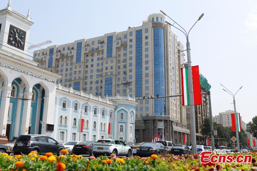 Flags of China and Tajikistan are seen in Dushanbe, capital of Tajikistan, on July 4, 2024, to welcome the visit of Chinese President Xi Jinping. (Photo: China News Service / Han Haidan)