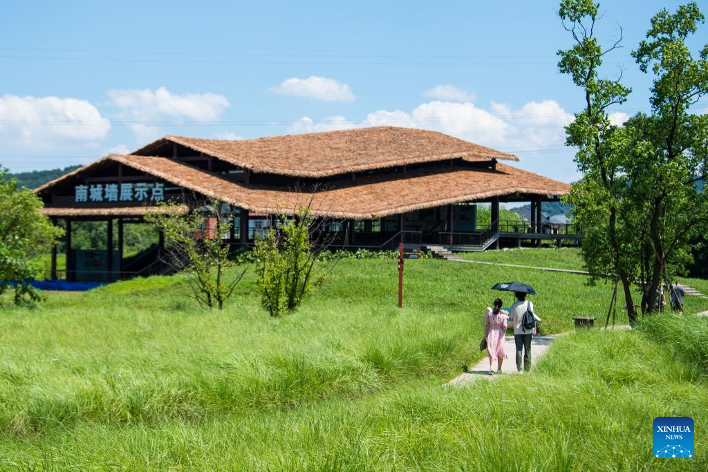 People visit a display spot of Southern City Wall Site at the Archaeological Ruins of Liangzhu City park in Hangzhou, capital city of east China's Zhejiang Province, July 4, 2024. The Archaeological Ruins of Liangzhu City, located in east China's Zhejiang Province, have gained worldwide recognition as bearing testimony to the existence of at least 5,000 years of Chinese civilization. This year marks the 5th anniversary of its inscription on the World Heritage List as a cultural site. (Xinhua/Jiang Han)