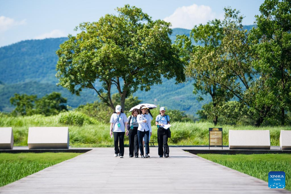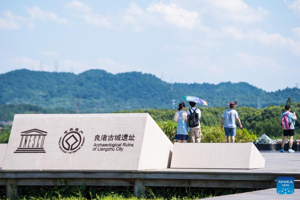 People visit the Mojiaoshan Palace Site at the Archaeological Ruins of Liangzhu City park in Hangzhou, capital city of east China's Zhejiang Province, July 4, 2024. The Archaeological Ruins of Liangzhu City, located in east China's Zhejiang Province, have gained worldwide recognition as bearing testimony to the existence of at least 5,000 years of Chinese civilization. This year marks the 5th anniversary of its inscription on the World Heritage List as a cultural site. (Xinhua/Jiang Han)
