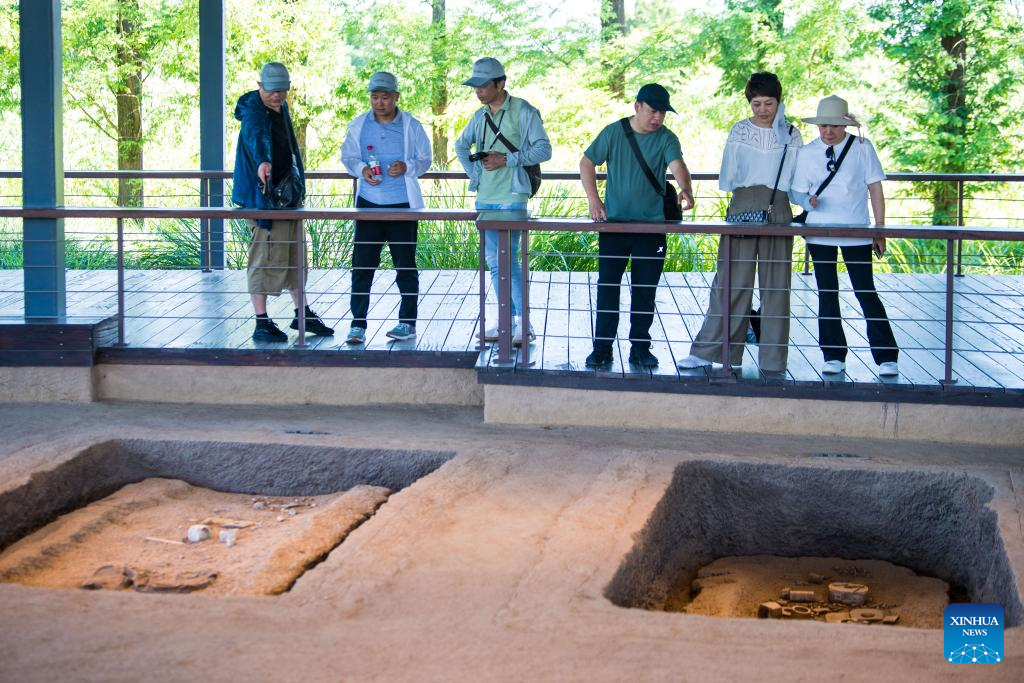 People visit the Fanshan Cemetery Site at the Archaeological Ruins of Liangzhu City park in Hangzhou, capital city of east China's Zhejiang Province, July 4, 2024. The Archaeological Ruins of Liangzhu City, located in east China's Zhejiang Province, have gained worldwide recognition as bearing testimony to the existence of at least 5,000 years of Chinese civilization. This year marks the 5th anniversary of its inscription on the World Heritage List as a cultural site. (Xinhua/Jiang Han)