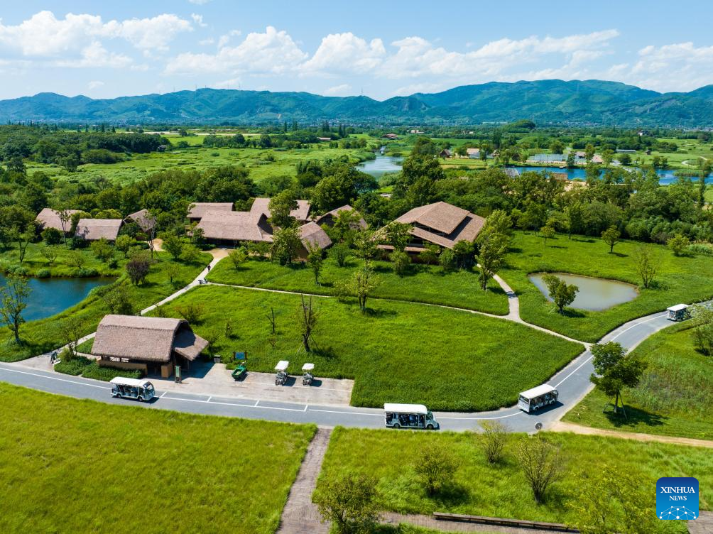 An aerial drone photo taken on July 4, 2024 shows the Archaeological Ruins of Liangzhu City park in Hangzhou, capital city of east China's Zhejiang Province. The Archaeological Ruins of Liangzhu City, located in east China's Zhejiang Province, have gained worldwide recognition as bearing testimony to the existence of at least 5,000 years of Chinese civilization. This year marks the 5th anniversary of its inscription on the World Heritage List as a cultural site. (Xinhua/Jiang Han)