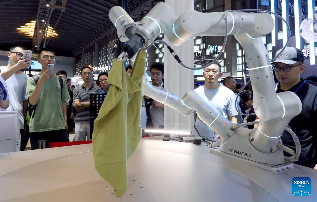A robot folds a piece of clothing during the 2024 World AI Conference in Shanghai, east China, July 5, 2024. AI-powered robots showcasing various skills have captivated lots of visitors during the 2024 World AI Conference. (Xinhua/Fang Zhe)