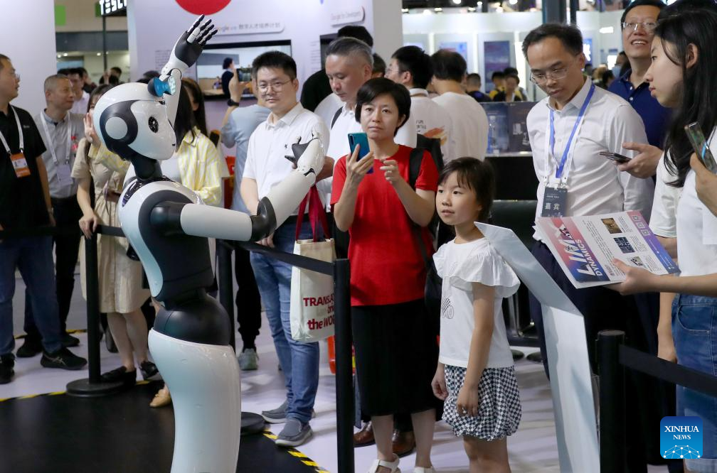 Visitors watch a robot dancing during the 2024 World AI Conference in Shanghai, east China, July 5, 2024. AI-powered robots showcasing various skills have captivated lots of visitors during the 2024 World AI Conference. (Xinhua/Fang Zhe)