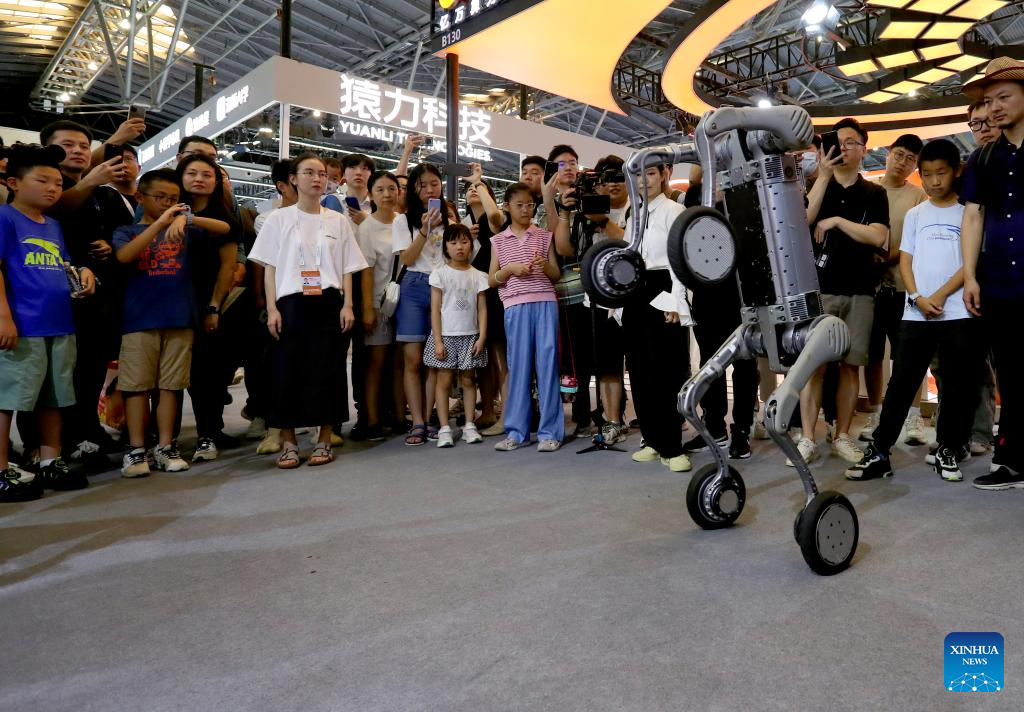 Visitors watch a robot walking upside down during the 2024 World AI Conference in Shanghai, east China, July 5, 2024. AI-powered robots showcasing various skills have captivated lots of visitors during the 2024 World AI Conference. (Xinhua/Fang Zhe)