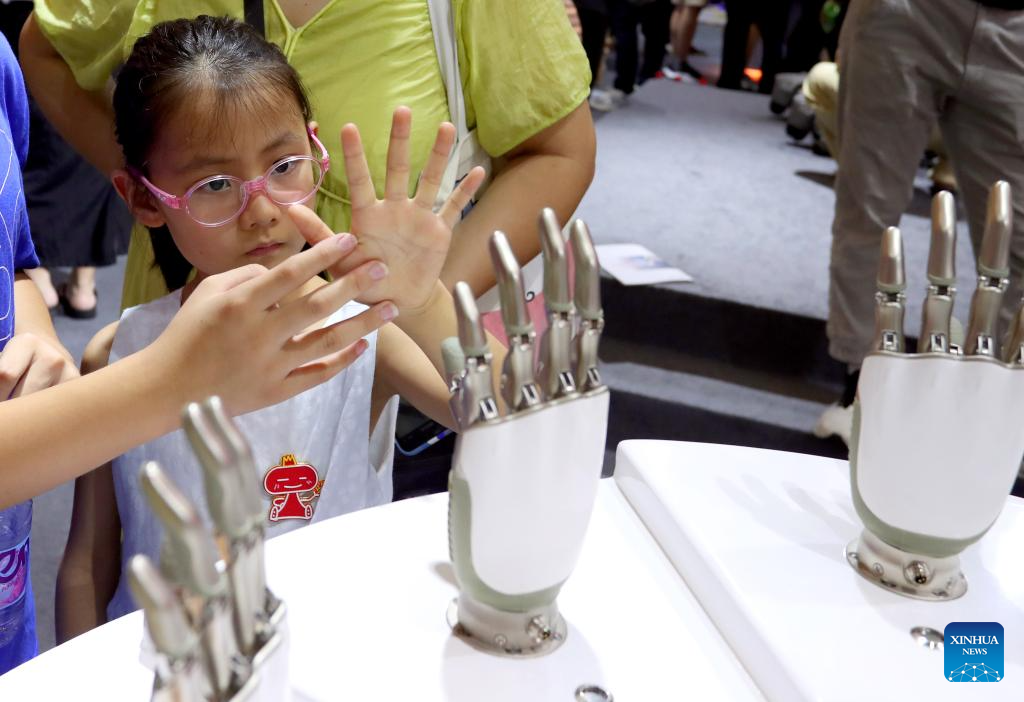 A child looks at mechanical hands during the 2024 World AI Conference in Shanghai, east China, July 5, 2024. AI-powered robots showcasing various skills have captivated lots of visitors during the 2024 World AI Conference. (Xinhua/Fang Zhe)