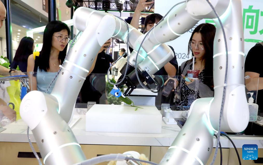 Visitors watch a robot peeling a cucumber during the 2024 World AI Conference in Shanghai, east China, July 4, 2024. AI-powered robots showcasing various skills have captivated lots of visitors during the 2024 World AI Conference. (Xinhua/Fang Zhe)
