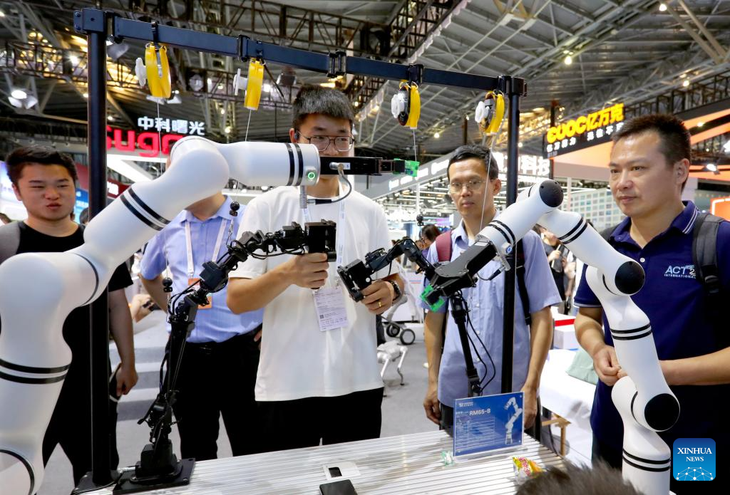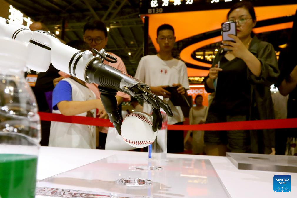 Visitors watch a bionic hand showcasing grab skill during the 2024 World AI Conference in Shanghai, east China, July 5, 2024. AI-powered robots showcasing various skills have captivated lots of visitors during the 2024 World AI Conference. (Xinhua/Fang Zhe)