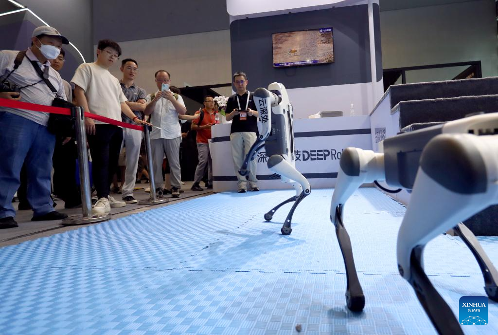 A quadruped robot demonstrates its upright walking skill during the 2024 World AI Conference in Shanghai, east China, July 5, 2024. AI-powered robots showcasing various skills have captivated lots of visitors during the 2024 World AI Conference. (Xinhua/Fang Zhe)