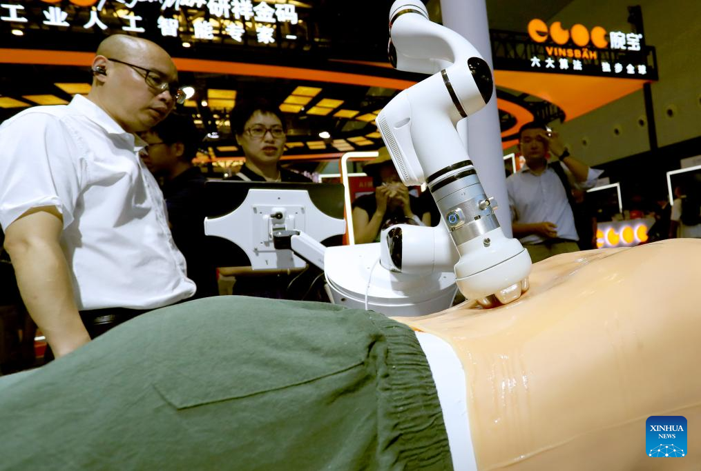 Visitors watch a robot demonstrating massage skills during the 2024 World AI Conference in Shanghai, east China, July 5, 2024. AI-powered robots showcasing various skills have captivated lots of visitors during the 2024 World AI Conference. (Xinhua/Fang Zhe)