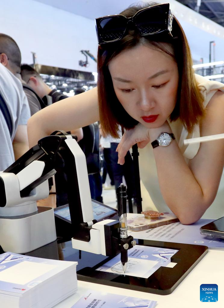 A visitor watches a robot drawing a picture during the 2024 World AI Conference in Shanghai, east China, July 5, 2024. AI-powered robots showcasing various skills have captivated lots of visitors during the 2024 World AI Conference. (Xinhua/Fang Zhe)