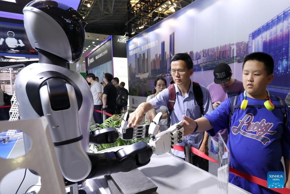 Visitors touch the bionic hands of a robot during the 2024 World AI Conference in Shanghai, east China, July 5, 2024. AI-powered robots showcasing various skills have captivated lots of visitors during the 2024 World AI Conference. (Xinhua/Fang Zhe)