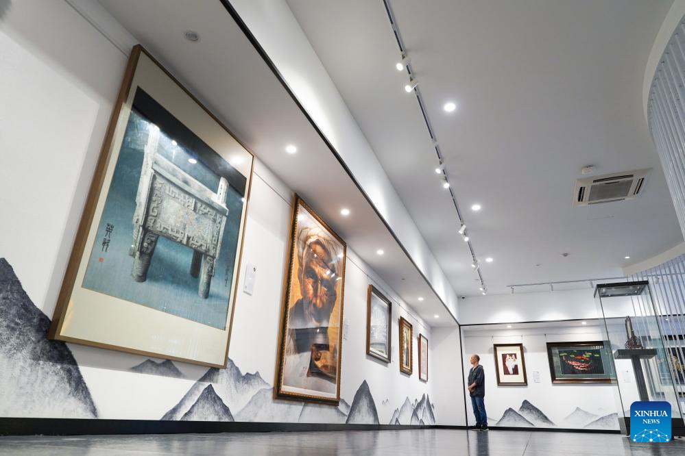 A man visits an embroidery art gallery at an industrial base of Suzhou embroidery in Zhenhu sub-district of Suzhou, east China's Jiangsu Province, July 3, 2024. Located in the Zhenhu sub-district of Suzhou, the industrial base of Suzhou embroidery is home to more than 400 Suzhou embroidery shops, workshops and companies, with the annual output value reaching nearly 1.5 billion yuan (about 200 million U.S. dollars). (Xinhua/Chen Shengwei)