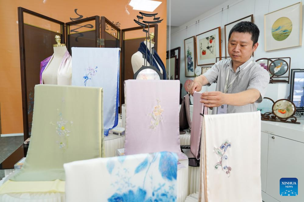 A staff member arranges Suzhou embroidery products at a shop in an industrial base of Suzhou embroidery in Zhenhu sub-district of Suzhou, east China's Jiangsu Province, July 3, 2024. Located in the Zhenhu sub-district of Suzhou, the industrial base of Suzhou embroidery is home to more than 400 Suzhou embroidery shops, workshops and companies, with the annual output value reaching nearly 1.5 billion yuan (about 200 million U.S. dollars). (Xinhua/Li Bo)