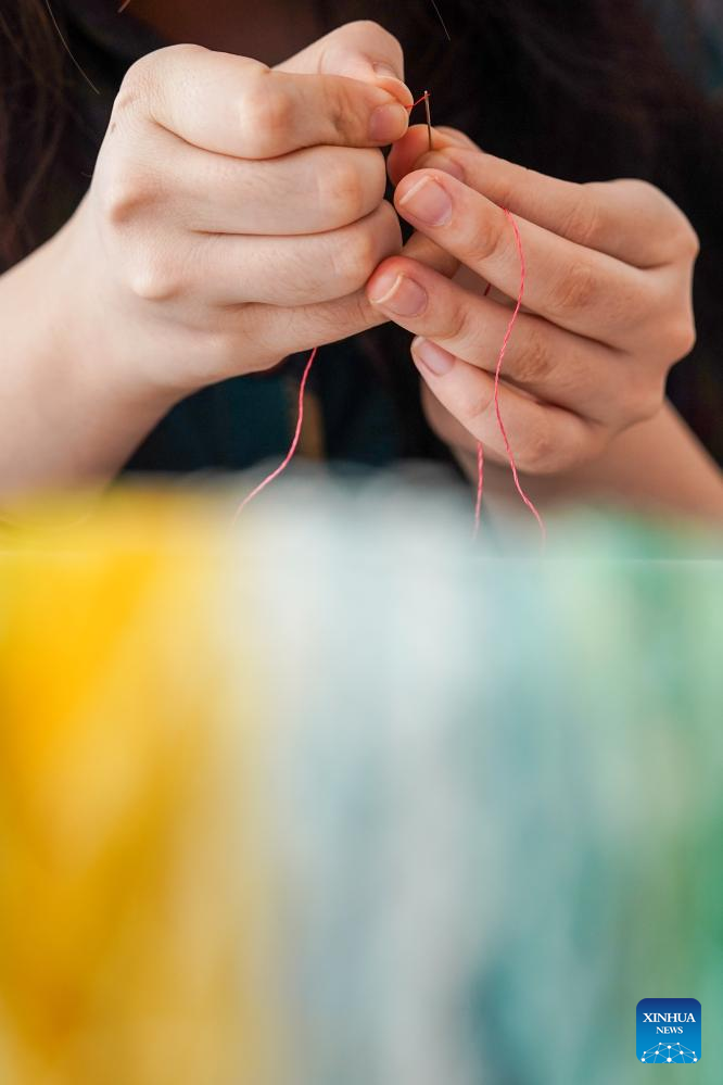A worker prepares strings for Suzhou embroidery products at a company in an industrial base of Suzhou embroidery in Zhenhu sub-district of Suzhou, east China's Jiangsu Province, July 3, 2024. Located in the Zhenhu sub-district of Suzhou, the industrial base of Suzhou embroidery is home to more than 400 Suzhou embroidery shops, workshops and companies, with the annual output value reaching nearly 1.5 billion yuan (about 200 million U.S. dollars). (Xinhua/Li Bo)