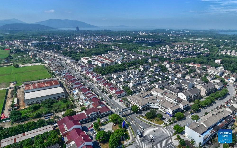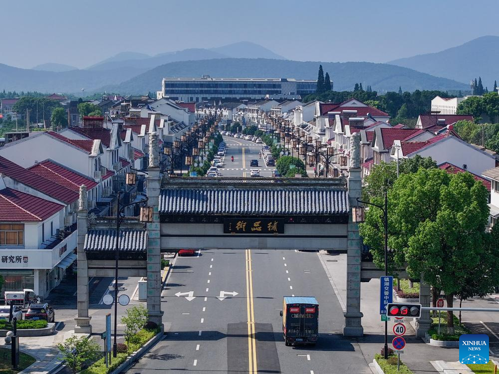 An aerial drone photo taken on July 3, 2024 shows a view of an industrial base of Suzhou embroidery in Zhenhu sub-district of Suzhou, east China's Jiangsu Province. Located in the Zhenhu sub-district of Suzhou, the industrial base of Suzhou embroidery is home to more than 400 Suzhou embroidery shops, workshops and companies, with the annual output value reaching nearly 1.5 billion yuan (about 200 million U.S. dollars). (Xinhua/Li Bo)