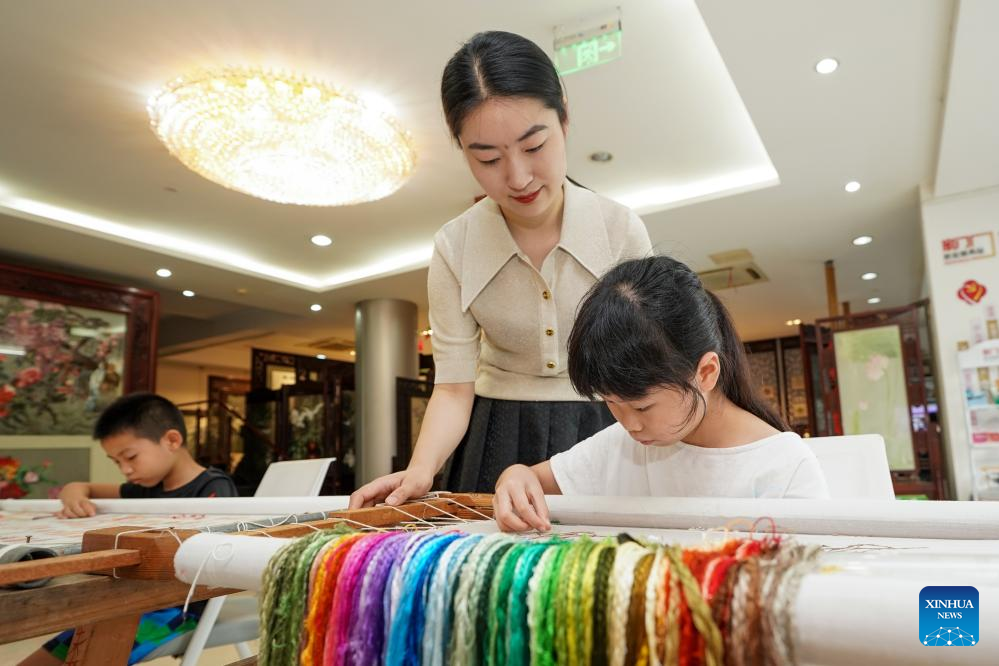 A child tries Suzhou embroidery at a workshop in an industrial base of Suzhou embroidery in Zhenhu sub-district of Suzhou, east China's Jiangsu Province, July 2, 2024. Located in the Zhenhu sub-district of Suzhou, the industrial base of Suzhou embroidery is home to more than 400 Suzhou embroidery shops, workshops and companies, with the annual output value reaching nearly 1.5 billion yuan (about 200 million U.S. dollars). (Xinhua/Li Bo)