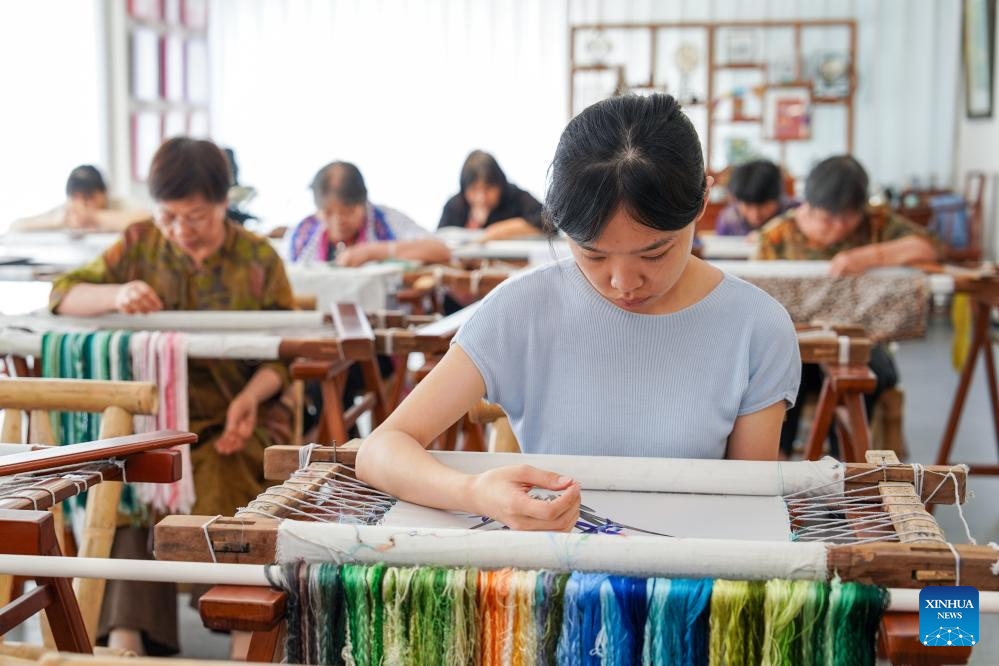 A worker makes a Suzhou embroidery product at a workshop in an industrial base of Suzhou embroidery in Zhenhu sub-district of Suzhou, east China's Jiangsu Province, July 3, 2024. Located in the Zhenhu sub-district of Suzhou, the industrial base of Suzhou embroidery is home to more than 400 Suzhou embroidery shops, workshops and companies, with the annual output value reaching nearly 1.5 billion yuan (about 200 million U.S. dollars). (Xinhua/Li Bo)