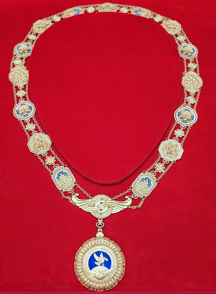 In its primary colors of golden and blue, the main body of the PRC Friendship Medal adopts elements including a peace dove, the Earth, a handshake, and a lotus, while the chain features elements such as Chinese knots, evergreens, peonies, a jade disc, and orchids. The medal is made with traditional craftsmanship such as filigree inlaid metal.