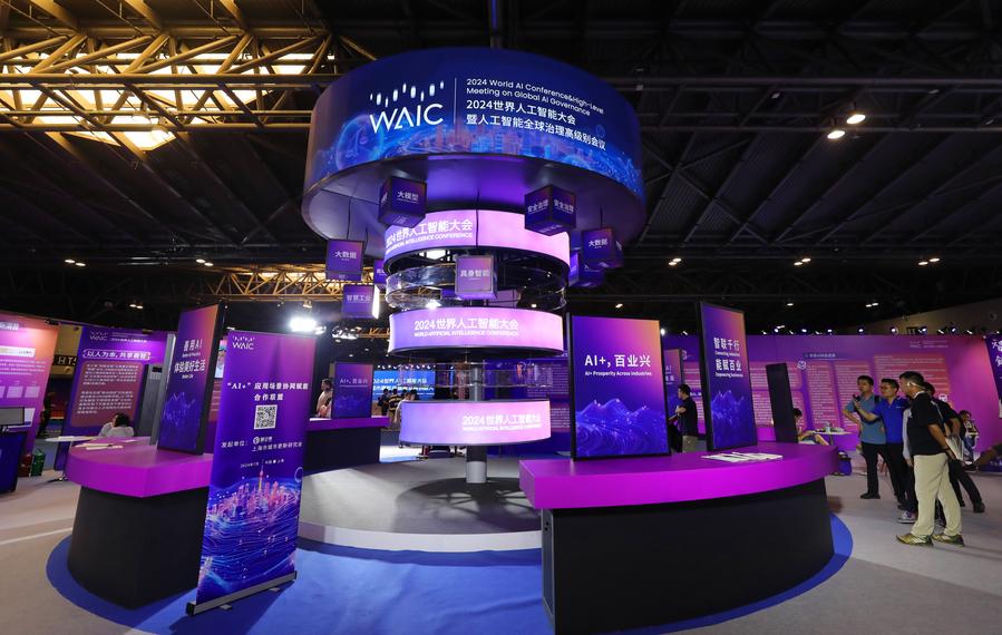 This photo shows an installation at the 2024 World AI Conference in Shanghai, east China, July 6, 2024. AI-powered products and applications have captivated lots of visitors during the 2024 World AI Conference. (Xinhua/Fang Zhe)