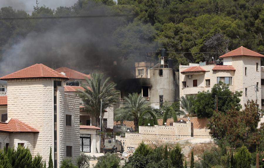 Smoke rises from a building on fire during an Israeli raid in the northern West Bank city of Jenin, on July 5, 2024. (Photo by Ayman Nobani/Xinhua)