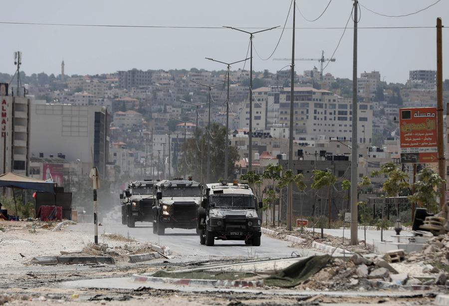 Israeli military vehicles are seen during an Israeli raid in the northern West Bank city of Jenin, on July 5, 2024. (Photo by Ayman Nobani/Xinhua)