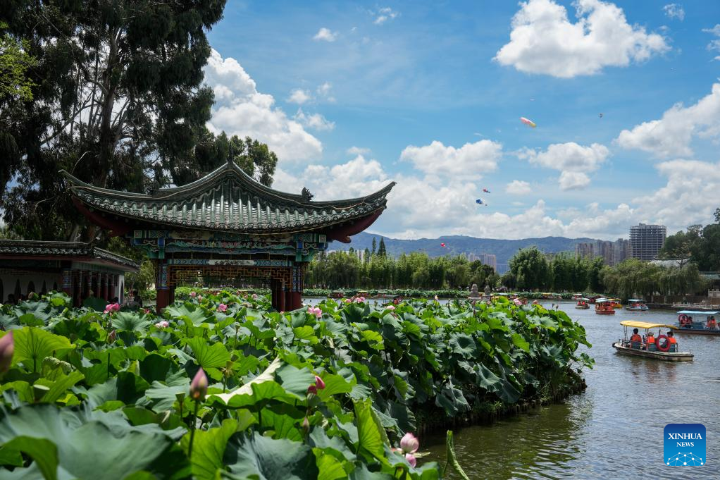 Visitors enjoy lotus flowers at Daguan Park in Kunming, southwest China's Yunnan Province, July 7, 2024. (Xinhua/Hu Chao)