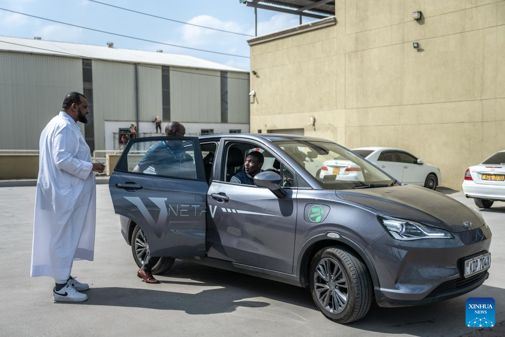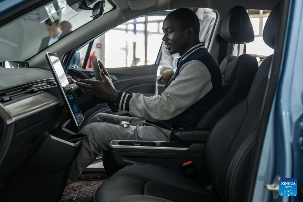 Customers prepare for a test drive at a store of Chinese automotive brand Neta in Nairobi, Kenya, July 5, 2024. Chinese automotive brand Neta announced its entry into the Kenyan market on June 26, 2024. (Xinhua/Wang Guansen)