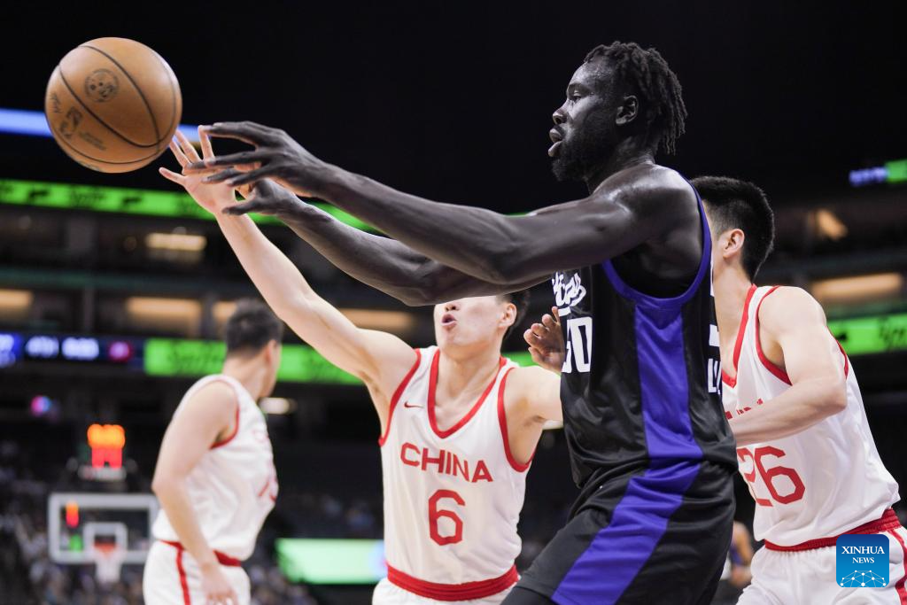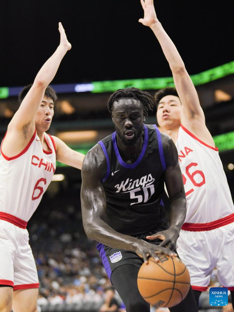 Jo Lual-Acuil Jr. (C) of Sacramento Kings 1 competes during the match between China and Sacramento Kings 1 at the 2024 California Classic NBA Summer League at the Golden 1 center in Sacramento, the United States, July 6, 2024. (Xinhua/Wu Xiaoling)