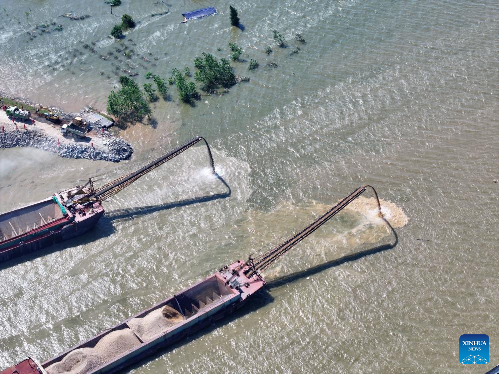 An aerial drone photo shows rescuers working to block the dike breach in the Dongting Lake in Huarong County, central China's Hunan Province, July 7, 2024. (Xinhua/Chen Sihan)