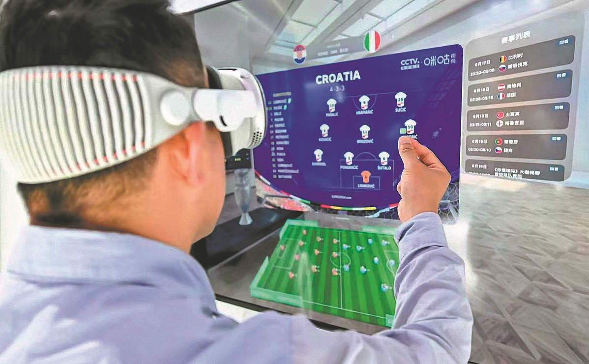 A user watches a UEFA Euro 2024 game through Apple's Vision Pro headset on the Migu Video app. (PHOTO/CHINA DAILY)