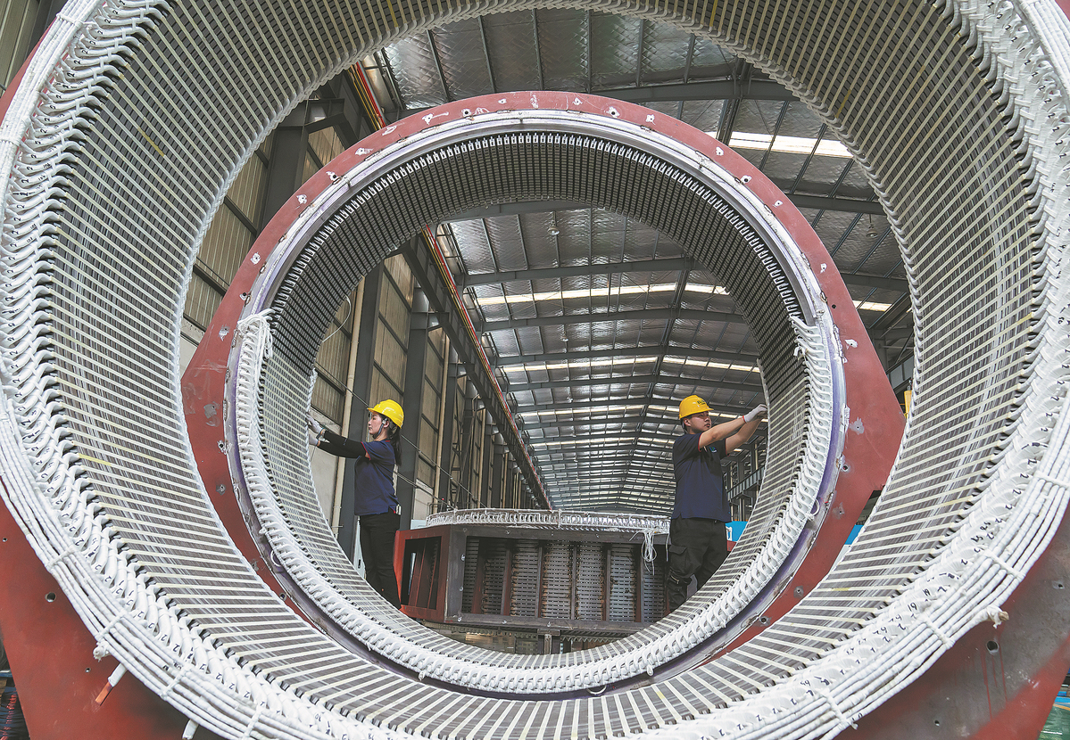 Employees work at an electrical machinery manufacturer in Haian, Jiangsu province. (ZHAI HUIYONG/XINHUA)