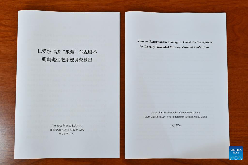 This photo taken on July 8, 2024 shows copies of the Chinese and English versions of A Survey Report on the Damage to Coral Reef Ecosystem by Illegally Grounded Military Vessel at Ren'ai Jiao during its releasing ceremony in Beijing, capital of China. (Xinhua/Li Xin)