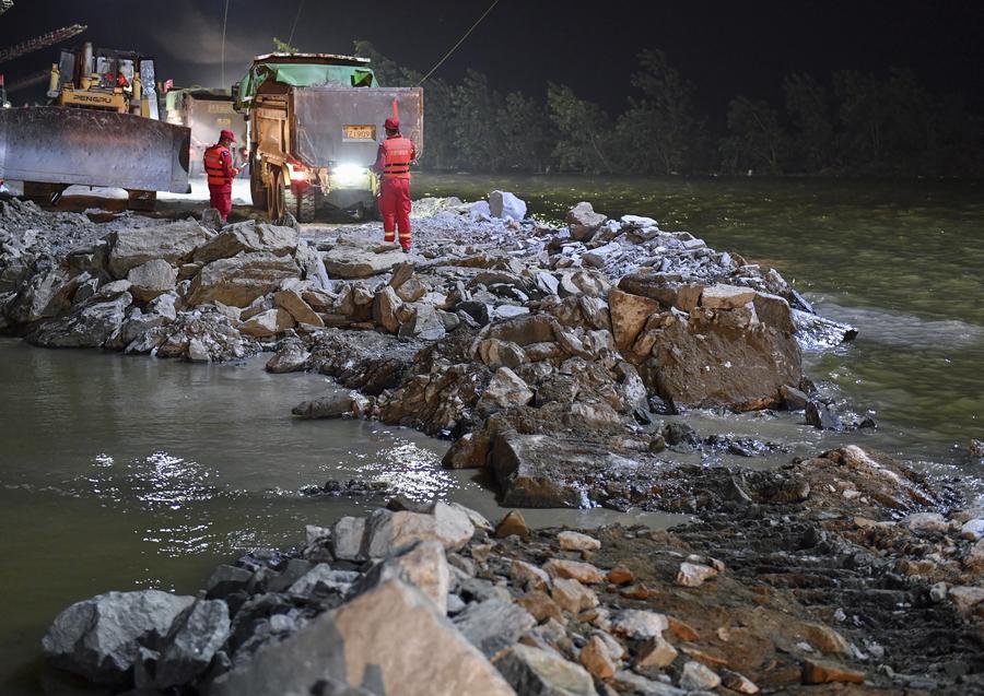 Rescuers seal the dike breach in the Dongting Lake in Yueyang, central China's Hunan Province, July 8, 2024. (Xinhua/Chen Zhenhai)
