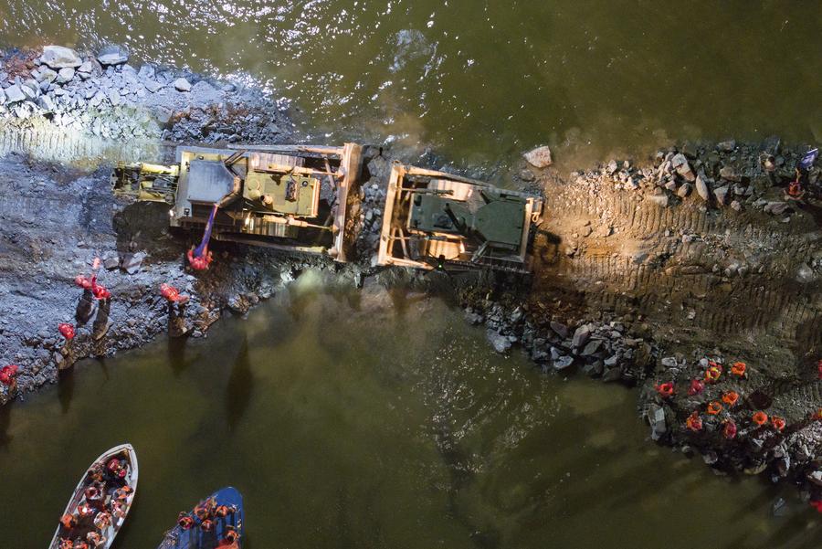 At 10:31 p.m., the final truckload of rocks was dumped into the breach in a dike at Dongting Lake, amidst the cheers of the rescue personnel.