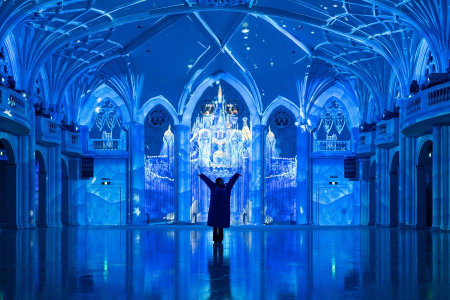 The long-awaited indoor theme park project, designed to maintain temperatures as low as minus 10 degrees Celsius, opened on Saturday. It features nine themed areas showcasing lifelike ice sculptures illuminated by colorful lighting.