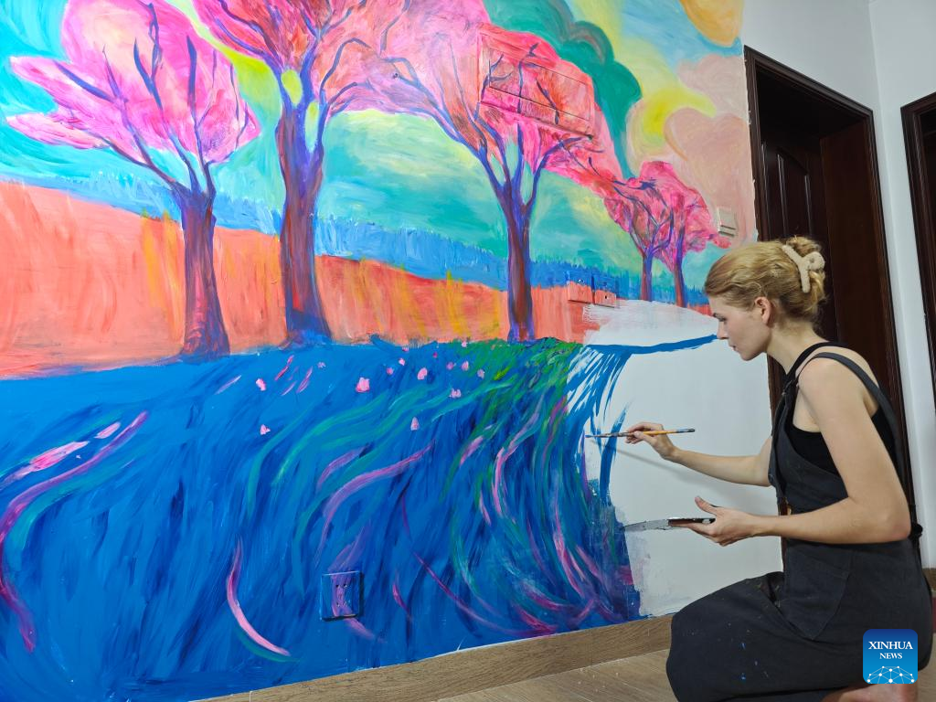 Russian artist Kuznetsova Aleksandra paints on the wall of her studio in Haikou, capital of south China's Hainan Province, June 14, 2024. (Xinhua/Zhou Huimin)