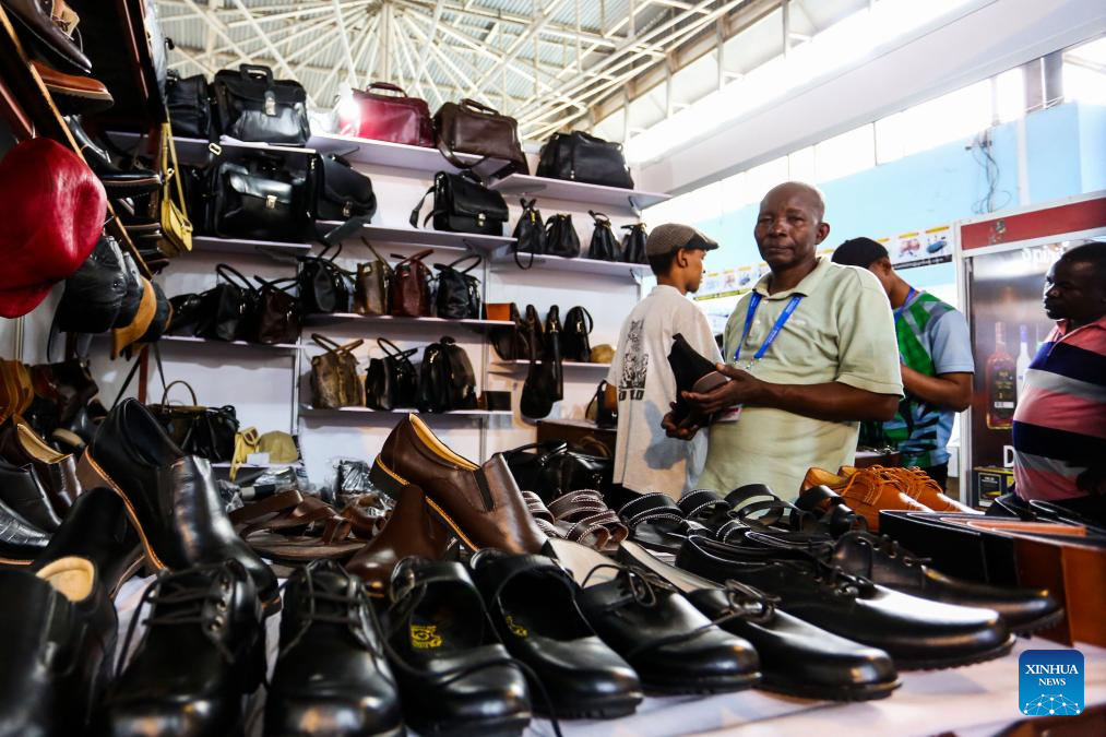 Leather shoes and bags made in China are displayed during the 48th Dar Es Salaam International Trade Fair (DITF) in Dar es Salaam, Tanzania, July 6, 2024. The 48th DITF, running from June 28 to July 13, hosted more than 4,000 exhibitors from 26 countries, including over 200 Chinese companies.(Photo by Emmanuel Herman/Xinhua)