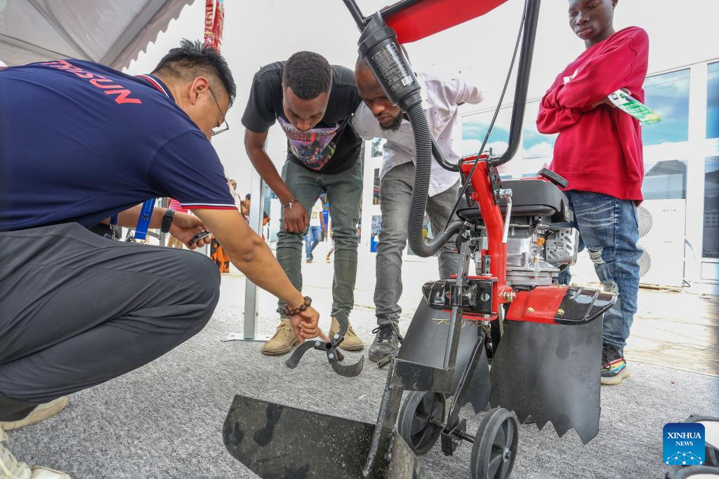 A Chinese exhibitor demonstrates an agricultural machine during the 48th Dar Es Salaam International Trade Fair (DITF) in Dar es Salaam, Tanzania, July 6, 2024. The 48th DITF, running from June 28 to July 13, hosted more than 4,000 exhibitors from 26 countries, including over 200 Chinese companies.(Photo by Emmanuel Herman/Xinhua)