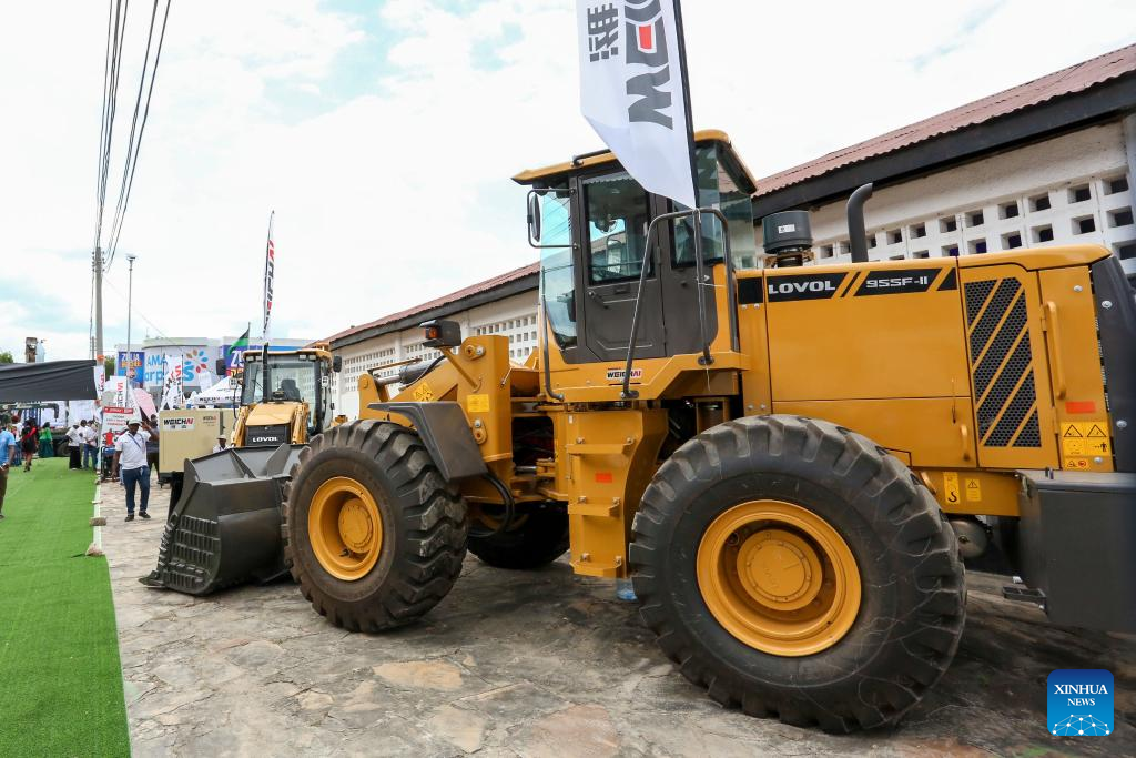 A bulldozer produced and shipped by a Chinese company is displayed at the 48th Dar Es Salaam International Trade Fair (DITF) in Dar es Salaam, Tanzania, July 6, 2024. The 48th DITF, running from June 28 to July 13, hosted more than 4,000 exhibitors from 26 countries, including over 200 Chinese companies.(Photo by Emmanuel Herman/Xinhua)