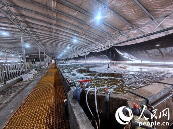 Photo shows the interior of a facility for South American white shrimp cultivation in Zhangye city, northwest China's Gansu Province. (People's Daily Online/Huang Jinxiaohu)
