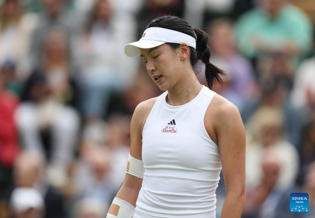 Wang Xinyu of China reacts during the women's singles 4th round match between Elina Svitolina of Ukraine and Wang Xinyu of China at Wimbledon tennis Championship in London, Britain, on July 8, 2024. (Xinhua/Li Ying)