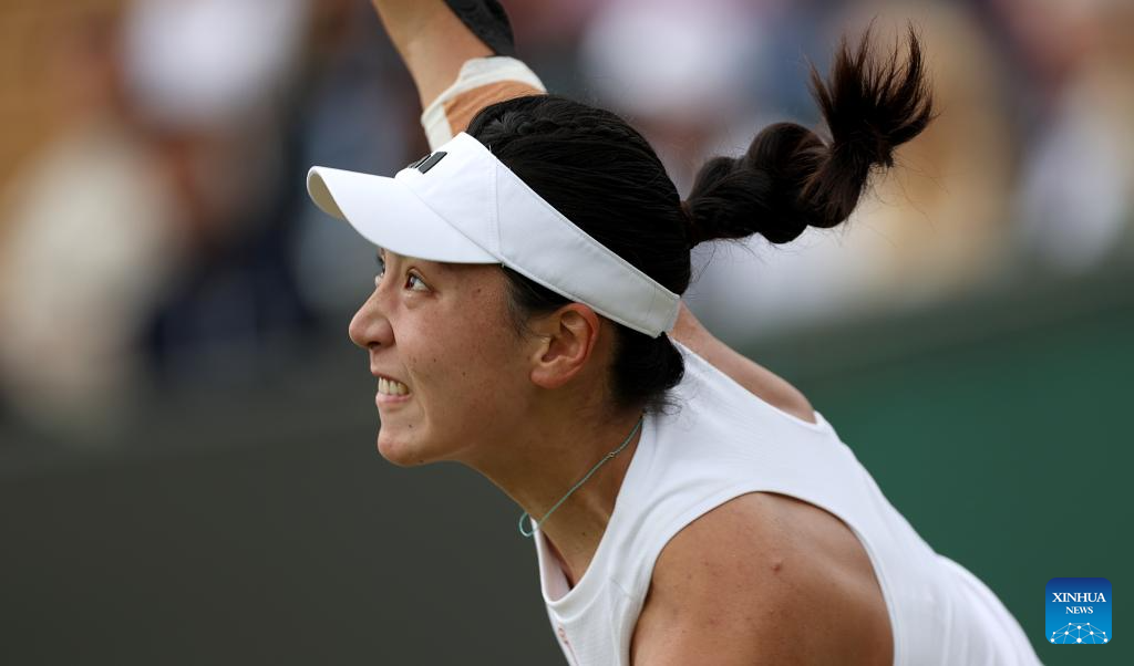 Wang Xinyu of China serves during the women's singles 4th round match between Elina Svitolina of Ukraine and Wang Xinyu of China at Wimbledon tennis Championship in London, Britain, on July 8, 2024. (Xinhua/Li Ying)
