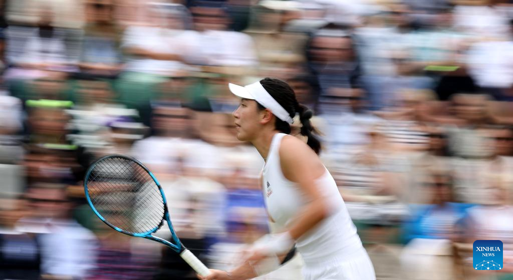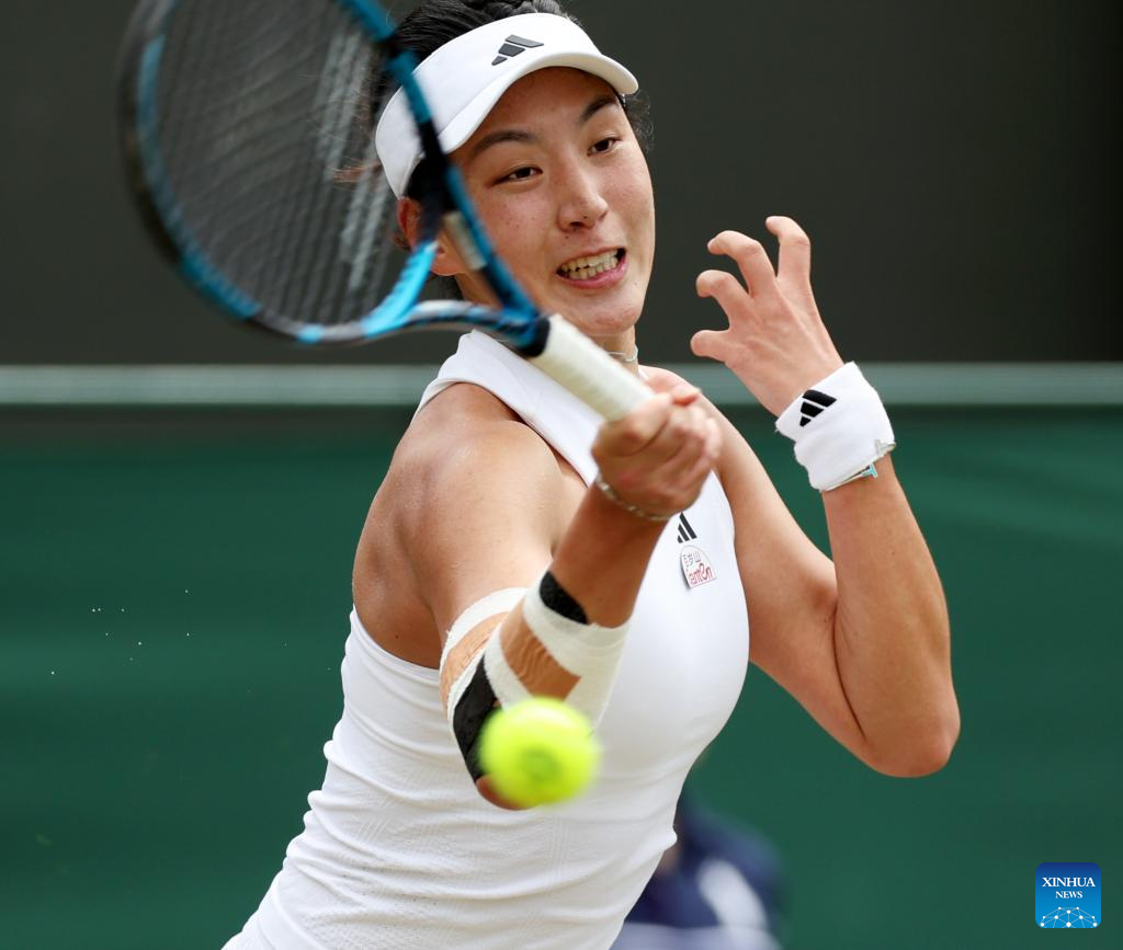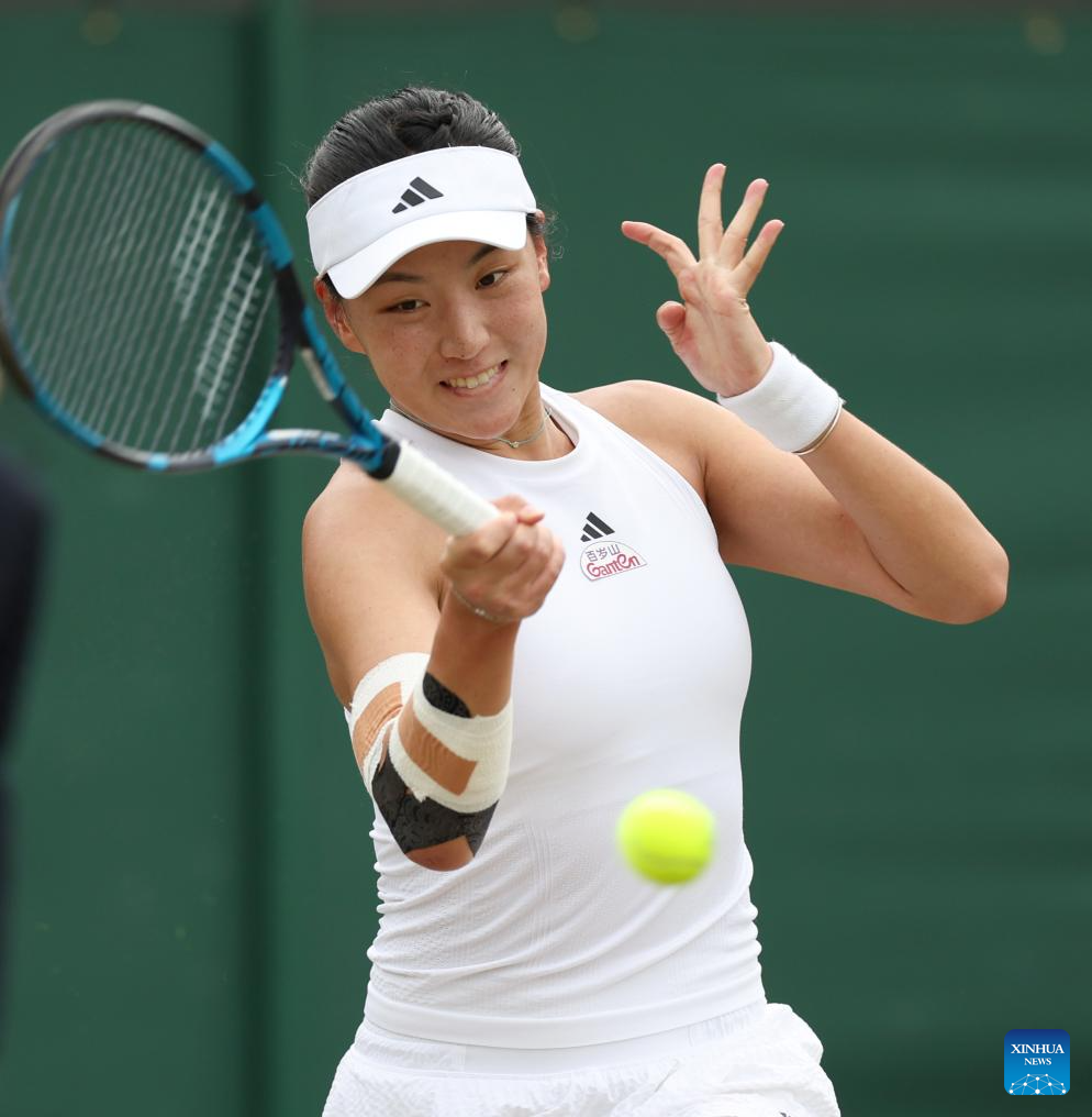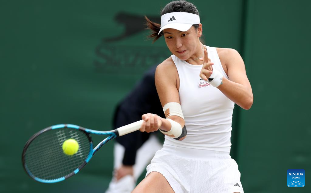 Wang Xinyu of China competes during the women's singles 4th round match between Elina Svitolina of Ukraine and Wang Xinyu of China at Wimbledon tennis Championship in London, Britain, on July 8, 2024. (Xinhua/Li Ying)