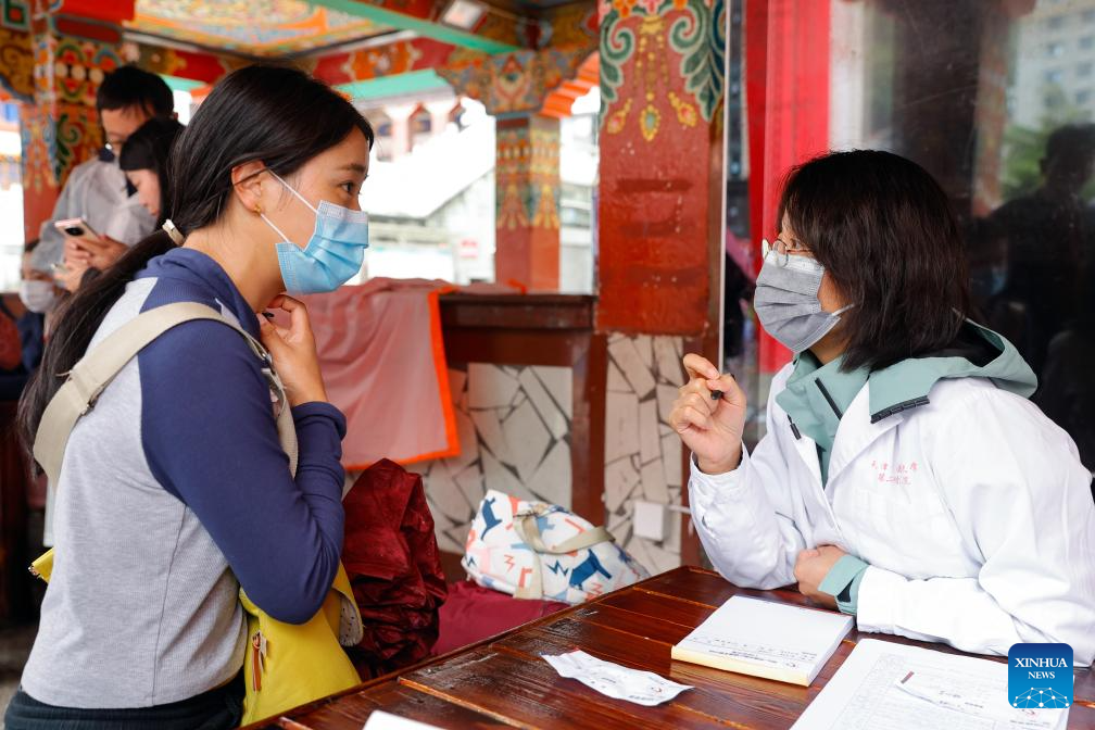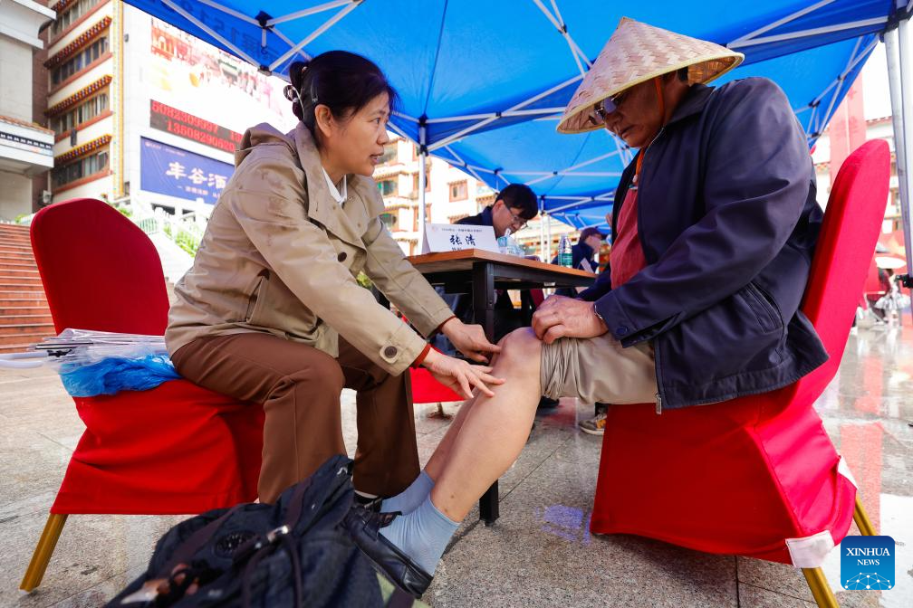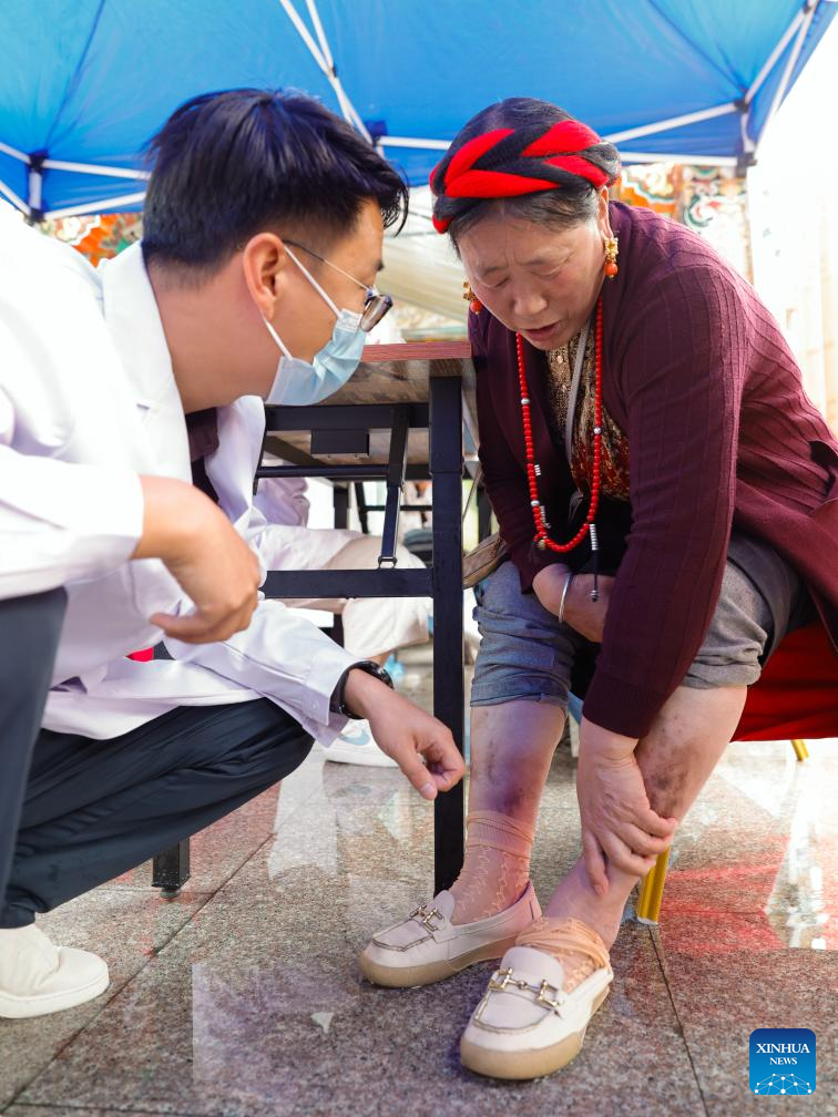 A medical volunteer treats a local resident in Kangding City of Garze Tibetan Autonomous Prefecture, southwest China's Sichuan Province, July 8, 2024. (Xinhua/Shen Bohan)