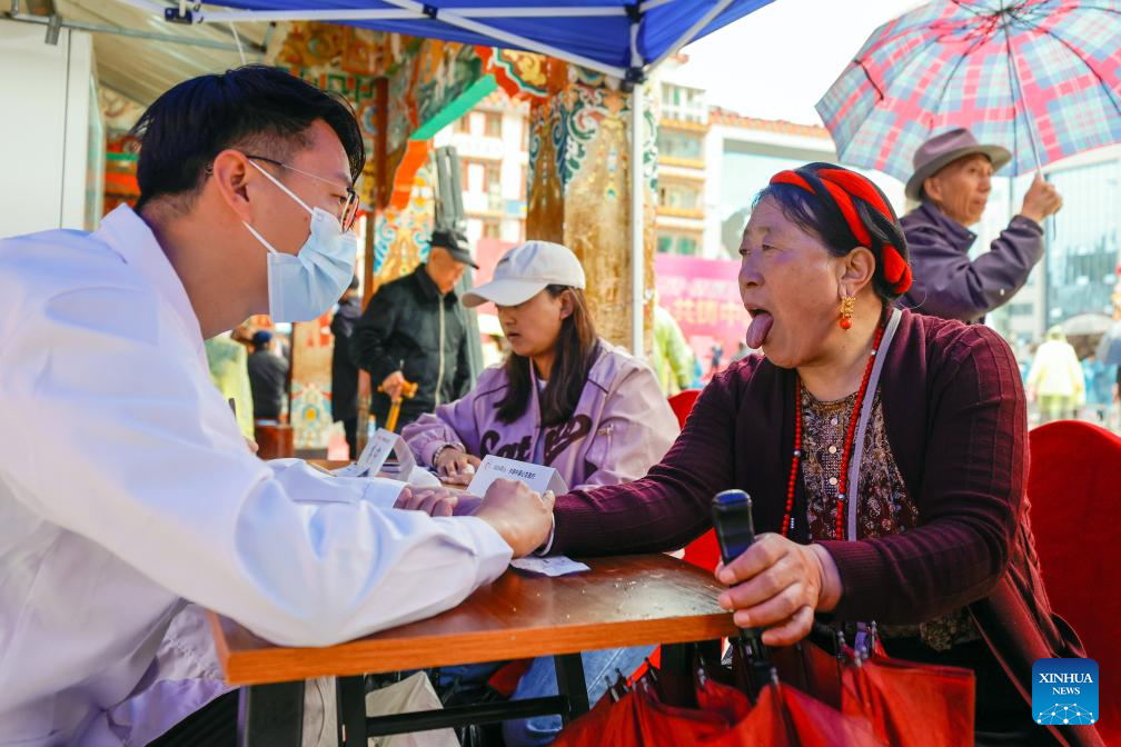 Medical volunteers treat local residents in Kangding City of Garze Tibetan Autonomous Prefecture, southwest China's Sichuan Province, July 8, 2024.?(Xinhua/Shen Bohan)
